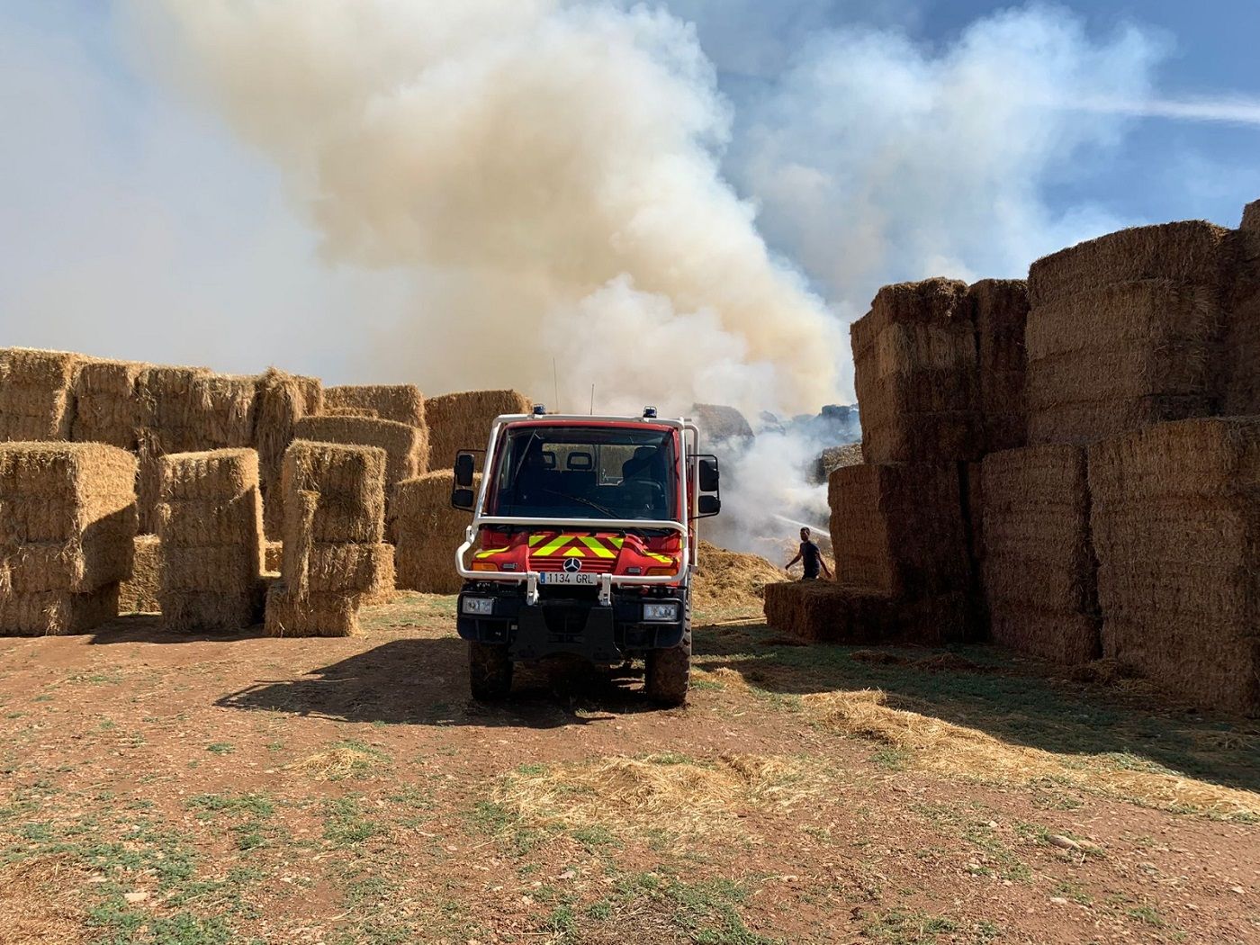 Efectivos del SPEIS del Parque de Sariñena han participado esta mañana en las labores de extinción de un incendio declarado en un campo próximo a la localidad y que ha afectado a 100.000 kilos de paja, que han ardido por completo. El fuego ha sido extinguido.