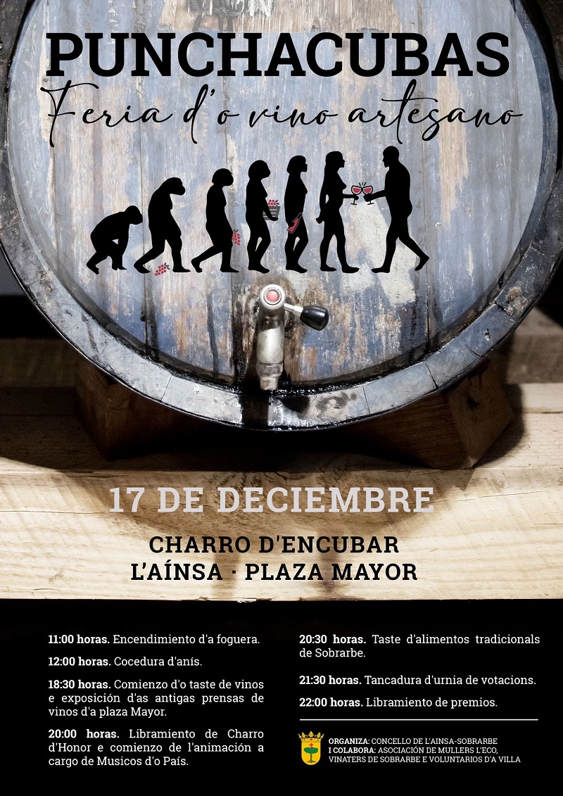 El acto festivo se inaugura este sábado 17 de diciembre a mediodía con el encendido de la hoguera en el centro de la plaza Mayor de Aínsa y la preparación y degustación del cocido de anís. No obstante, la actividad central y la que logra aglutinar a la mayor cantidad de público es la cata de vinos, prevista a las 18h. Es entonces cuando, en mesas distribuidas en torno a la hoguera, se dan a probar los vinos producidos en las casas sobrarbenses que aún siguen dedicándose a esta tarea y desean compartirlos.