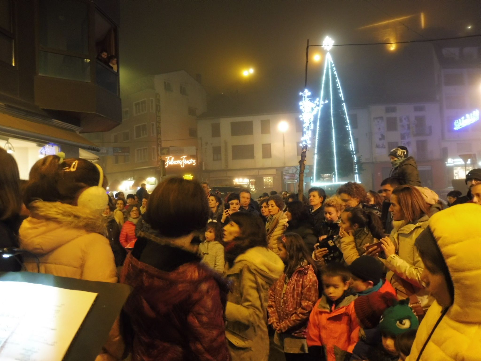 Aínsa ha recibido la Navidad con el encendido de luces este jueves. Un evento en que no faltó un pequeño concierto de villancicos con los alumnos y profesores de la Escuela de Música y Danza José María Campo, y el reparto de chocolate con torta en el popular cruce de caminos de la localidad.