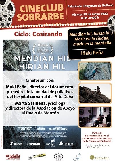 La primera de las proyecciones es el viernes 13 de mayo a las ocho de la tarde en el Palacio de congresos de Boltaña. Se proyecta el título “Mendian hil hirian hil (Morir en la ciudad morir en la montaña)”, gracias a la colaboración de la Asociación de Apoyo al Duelo de Monzón. Se trata de un trabajo grabado en diferentes lugares de la geografía vasca y navarra, que cuenta con diferentes testimonios de quienes han vivido muy de cerca la muerte de algún ser querido en la montaña o en la ciudad. También se recogen los testimonios de profesionales como médicos o psicológicos especializados en los procesos de duelo y los cuidados paliativos.