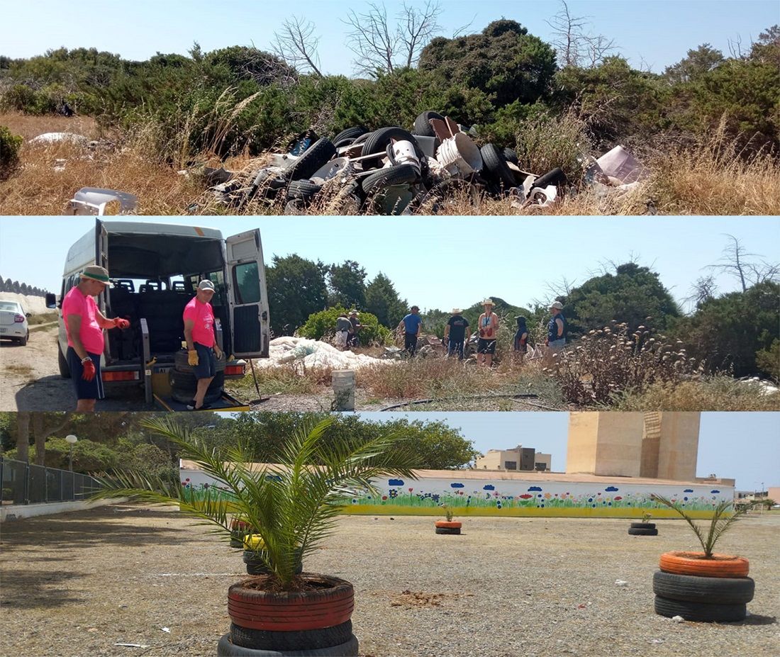 Se les ocurrió que para las palmeras podrían utilizar de maceteros algunos de los neumáticos que algún desaprensivo, por ser suave y poco faltón, tiró en el espacio protegido de Punta Entinas Sabinar, de donde ya se han retirado en diferentes campañas de voluntariado ambiental vecinal más de dos mil unidades. Utilizaron unos cuarenta, pero retiraron algunos más que llevaron al punto limpio del municipio.