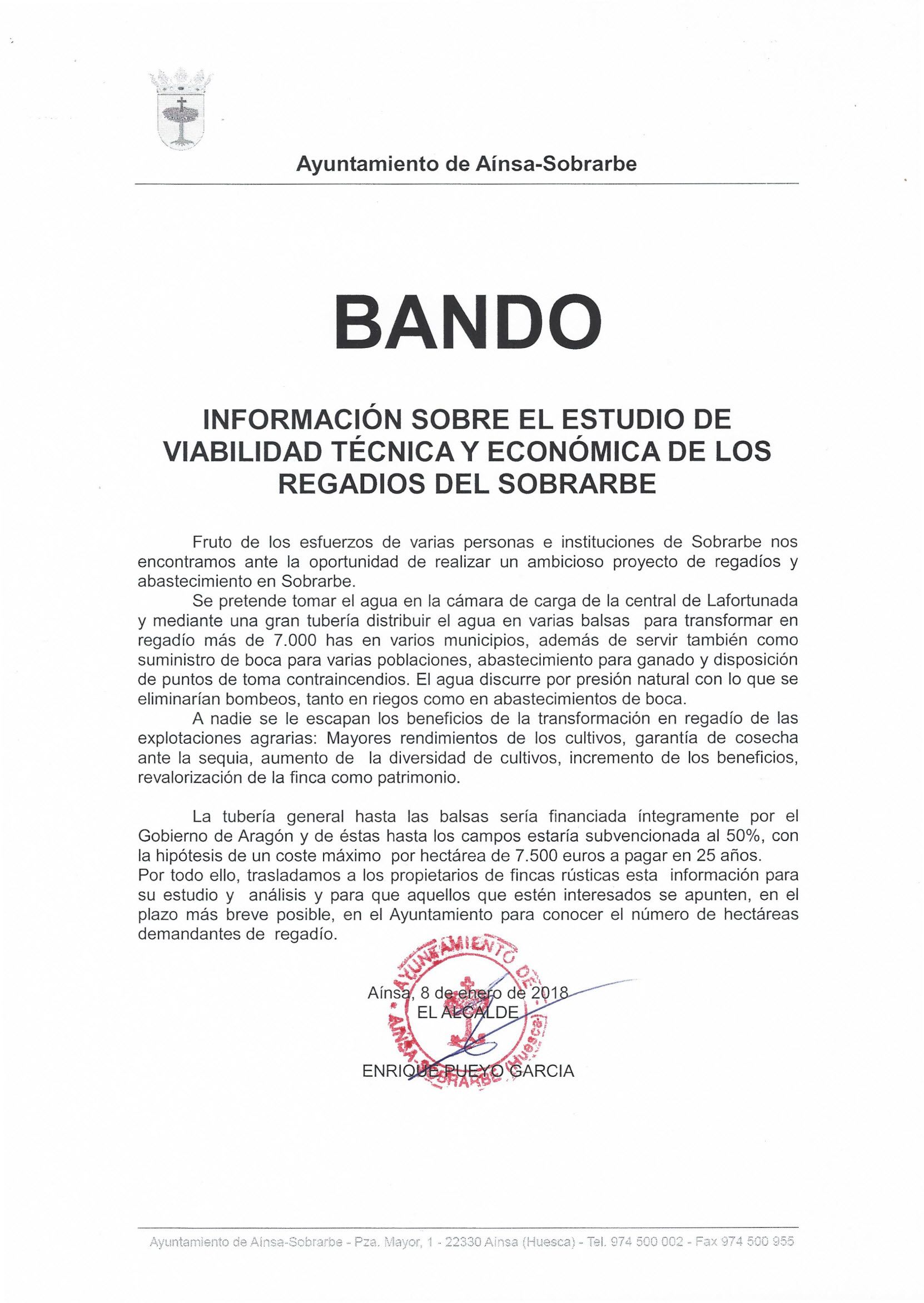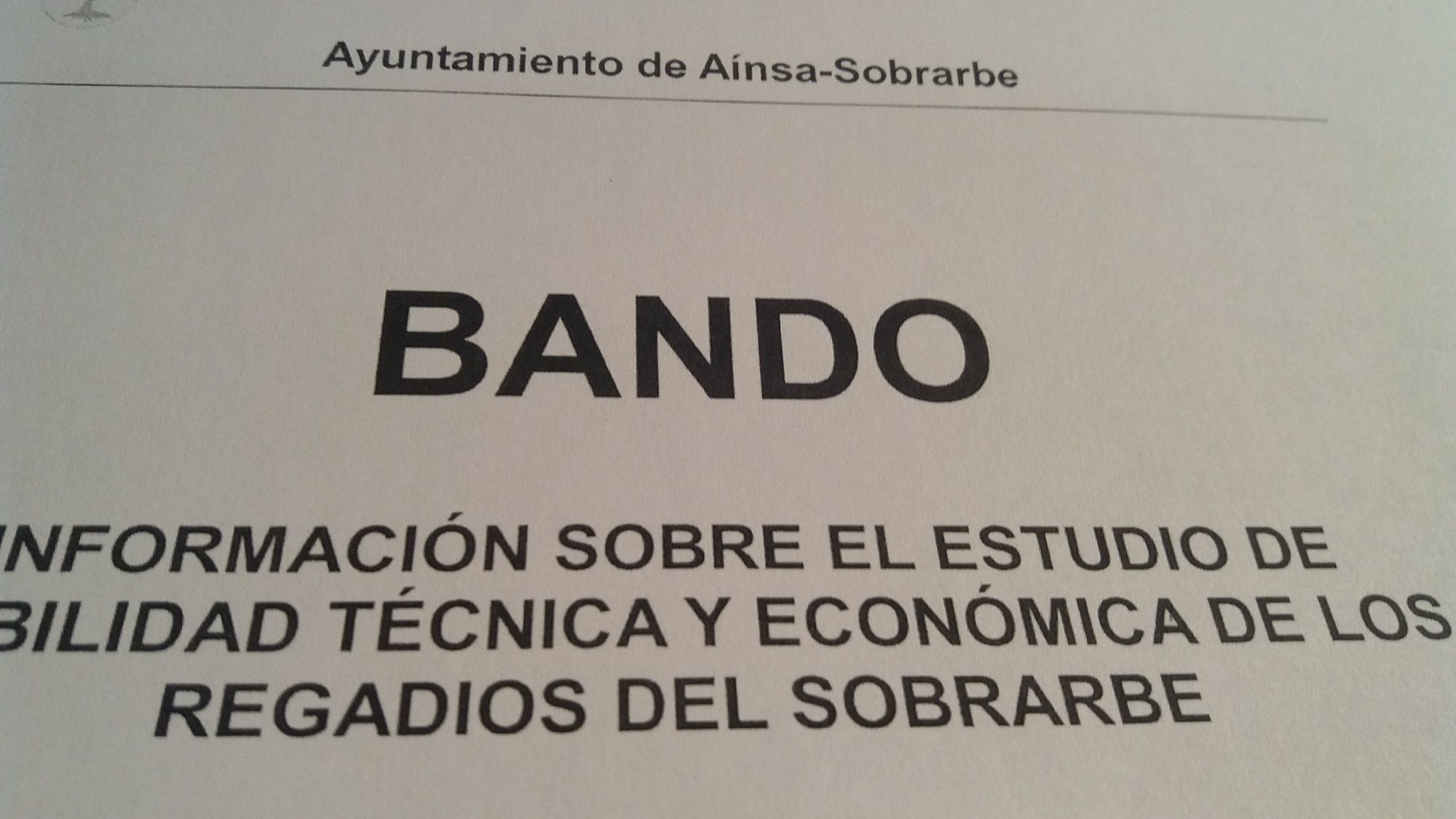 El Ayuntamiento de Aínsa a través de un bando informa sobre el ‘Estudio de Viabilidad Técnica y Económica de los Regadíos del Sobrarbe‘.