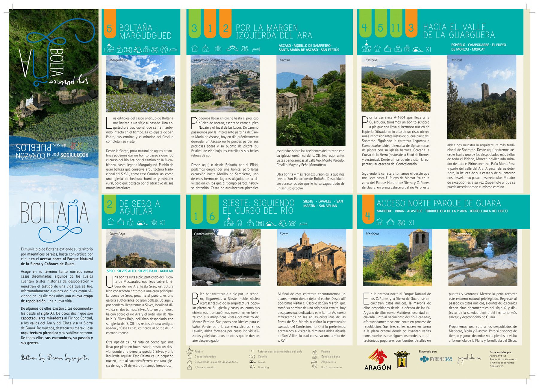 El Ayuntamiento de Boltaña acaba de editar un folleto divulgativo de todos los pueblos que forman parte de su territorio. En él se describen los lugares de interés y rutas de senderismo, así como rutas en coche para enlazarlos. Se presenta en formato de mapa de bolsillo.