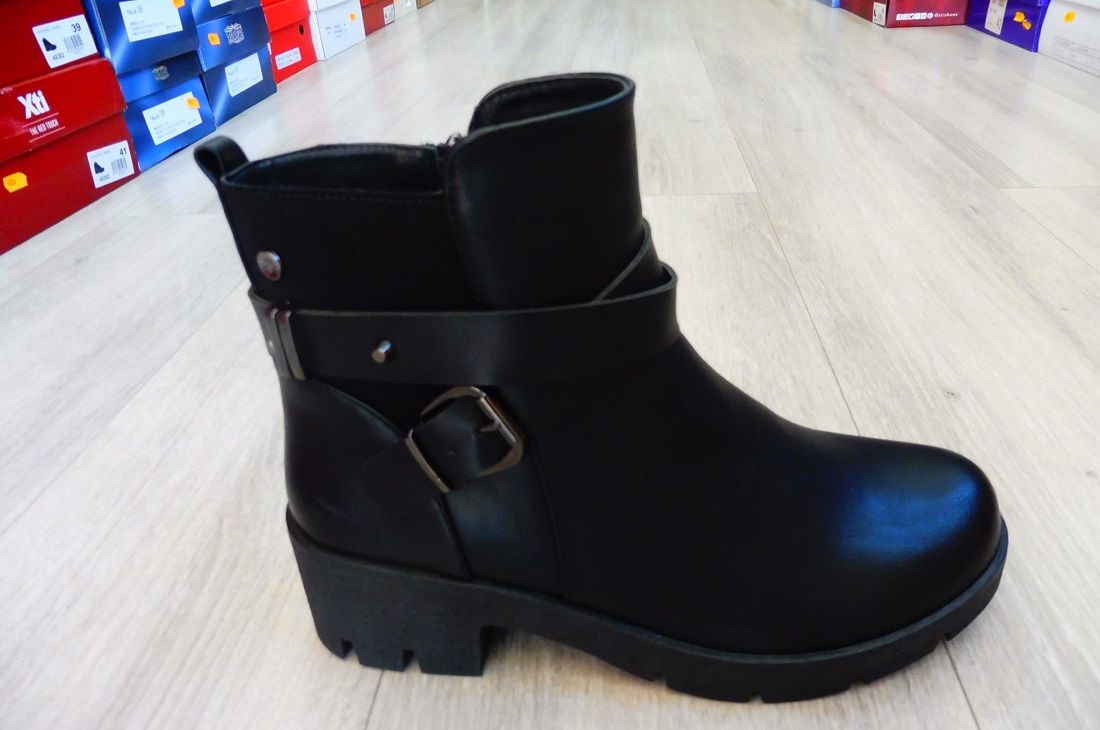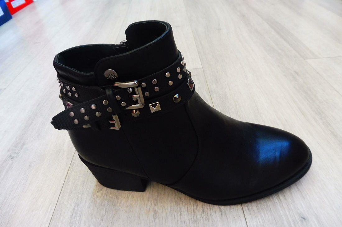En botines podemos resaltar las botas moteras cómo por ejemplo de la casa Xti, en color negro, caña baja, puntera redondeada, suela contundente y algún detalle como elásticos, tachuelas y otras aplicaciones que añadan agresividad.