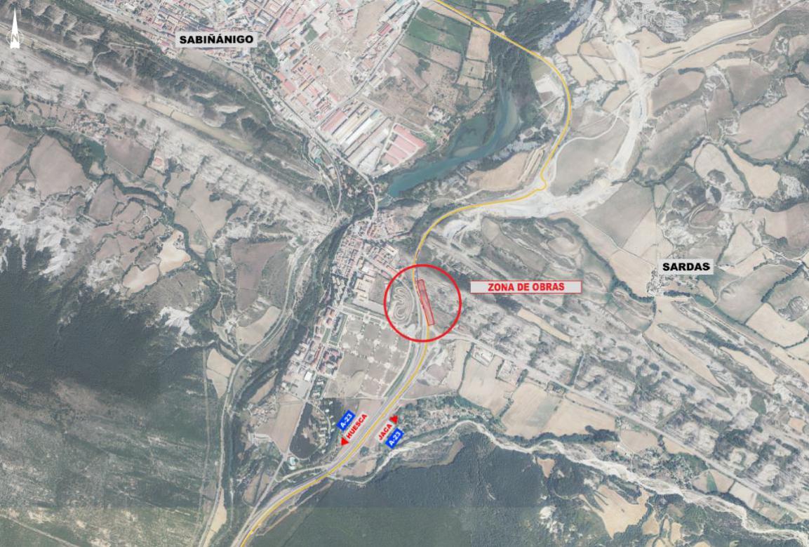 Para ello, se cortará el acceso a la N-330 en sentido Huesca desde la glorieta de Sardas, en el kilómetro 626,8, hasta la glorieta de Fiscal (kilómetro 625,8). El sentido Jaca se mantiene por el carril contrario de la N-330 (actual sentido Huesca), liberando así su carril actual, muy próximo a las obras.