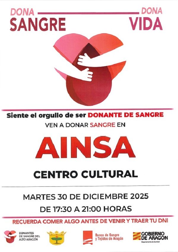 AinsaAlto AragónSanidadSobrarbeSociedad Donación de sangre en Aínsa el 30 de diciembre 07/12/2025 - 11:38 Cartel anunciador. La unidad móvil de Banco de Sangre de Aragón llegará al Centro Cultural de Aínsa, el martes 30 de diciembre, en horario de 17:30 a 21 horas. Recuerda comer algo antes de venir y traer tu DNI. Cartel anunciador.