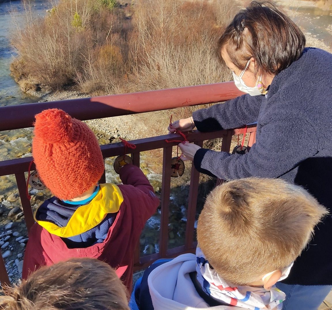 Este lunes alrededor de 280 alumnos de Infantil y Primaria acudían por turnos al puente del río Ara a colocar bonitos adornos preparados en clase.