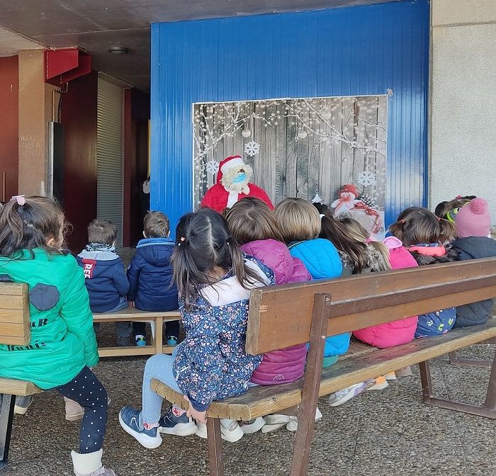 La programación navideña escolar concluía este martes a mediodía con la visita de Papá Noel al patio del colegio de Aínsa. El evento, como era de esperar, ha sido recibido con gran alborozo por parte de niños y niñas de infantil y primeros cursos de primaria. Papá Noel había dejado su trineo aparcado en Monte Perdido, pero eso no ha impedido que llegara cargado de monedas de chocolate para repartir entre el público a modo de adelanto de la gran noche del 24.