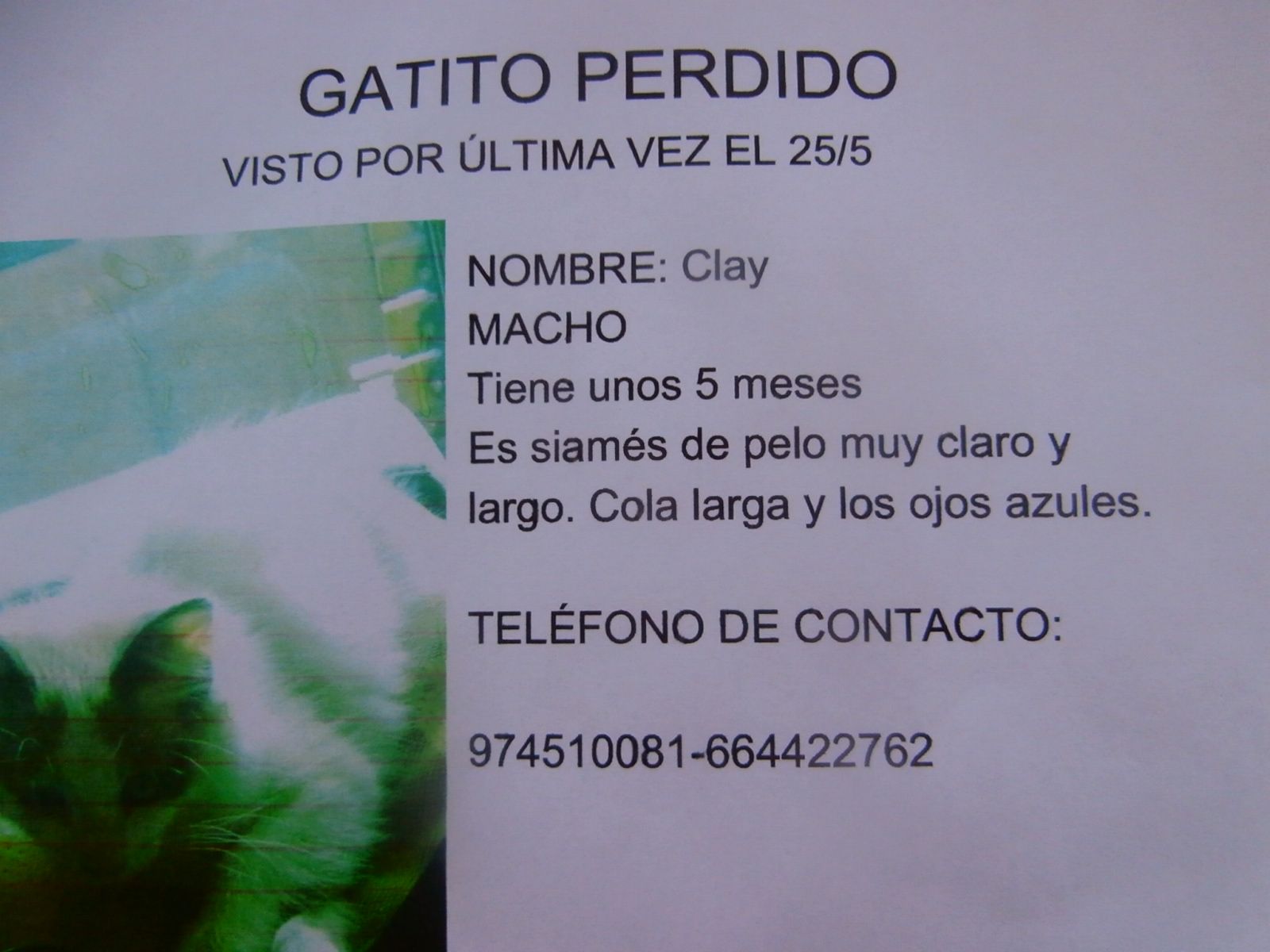 Se ha perdido un gatito de unos cinco meses en Aínsa. Se lama Clay, macho, es siamés de pelo claro y largo. Cola larga y ojos azules. Fue visto por última vez el viernes día 25.