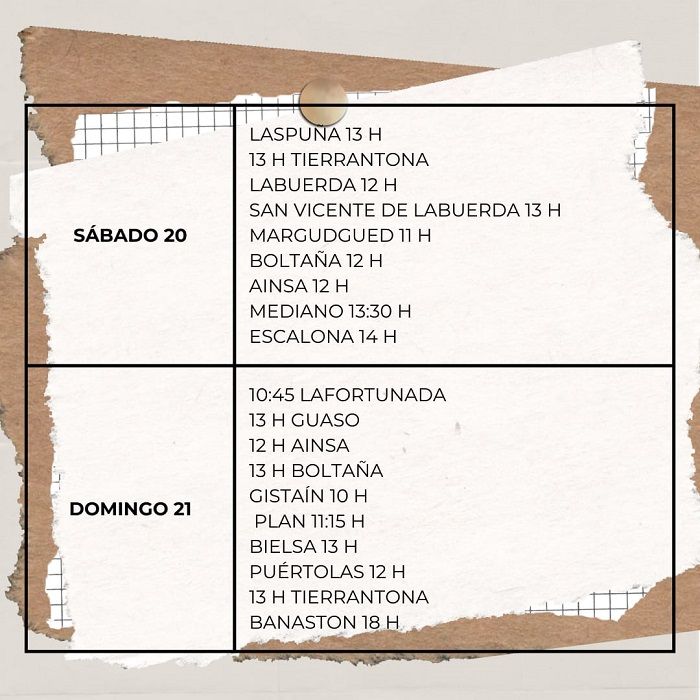 Sábado día 20: 13h Laspuña; 13h Tierrantona; 12h Labuerda; 13h San Vicente de Labuerda; 11h Margudgued; 12h Boltaña; 12h Aínsa; 13:30h Mediano y 14h en Escalona.