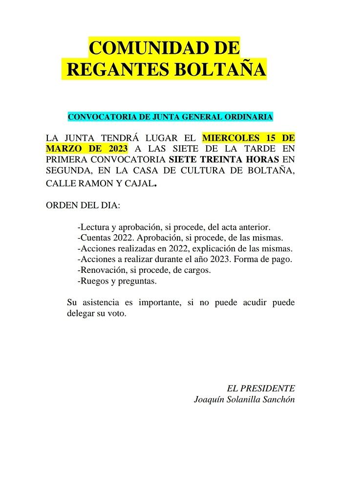 La Comunidad de Regantes de Boltaña celebrará el miércoles día 15 de marzo, su Junta General Ordinaria, a las 19h en primera convocatoria, y a las 19:30h en segunda convocatoria, en la Casa de Cultura de la localidad.