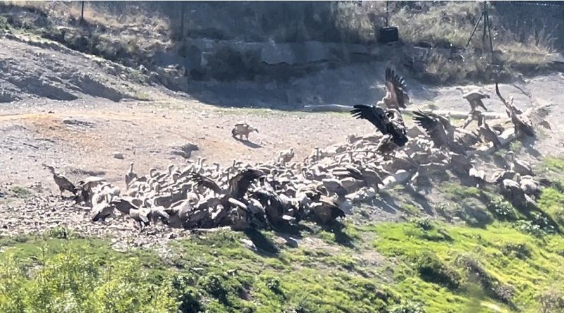 Las sorpresas no se hicieron esperar: plumas de cárabo y de cuervo, una curruca capirotada, huellas de jabalí, rastros de zorro y numerosos buitres leonados, que acabaron convirtiéndose en los protagonistas del final de la jornada. La actividad concluyó con un aporte de alimentación en directo, en el comedero de aves necrófagas que la FCQ tiene en las proximidades de Aínsa. Gracias a Álvaro y a la Fundación, pudimos no sólo comprender el importante papel que las aves necrófagas tienen en el ecosistema, si no también ver, en primera persona, a más de ciento cincuenta de estas rapaces alimentarse ante nosotros.