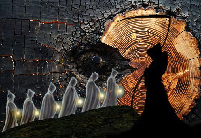 Hacía un sol de justicia, así que buscaba la sombra de las adelfas, el frescor de los taráis, y los bonitos amarillos de las olivardas pegajosas que florecen en otoño para la satisfacción de los insectos. Fija mi atención en un pequeño y rojo caballito del diablo, debe ser otra señal, no me percaté por donde apareció la Santa Arbolada, una procesión de 100 árboles talados, encabezada por un mortal que llevaba una azada, un cubo con agua y un bote de semillas que hacía sonar rítmica y alegremente.