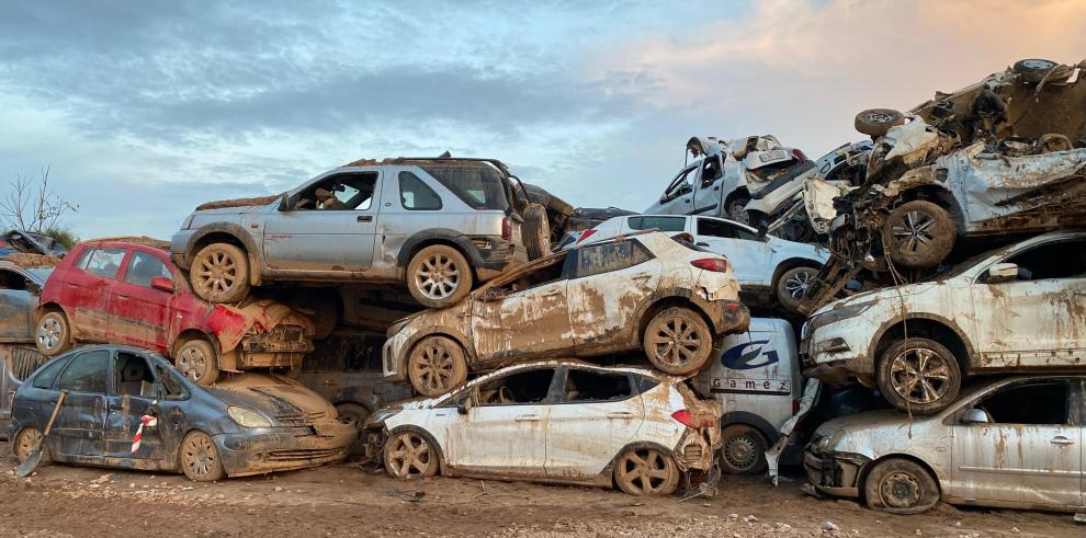 Miles de vehículos retirados por el operativo aragonés en Catarroja están siendo achatarrados en la campa anexa al Puesto de Mando Avanzado (PMA) del Gobierno de Aragón para evitar cualquier riesgo de incendio de los residuos cerca del casco urbano.