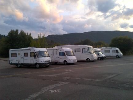 Estas cinco autocaravanas, estaban estacionadas, como se aprecia en la imagen, ordenadamente, en la villa de Aínsa, este domingo sobre las 19:30 horas, y no llovía.