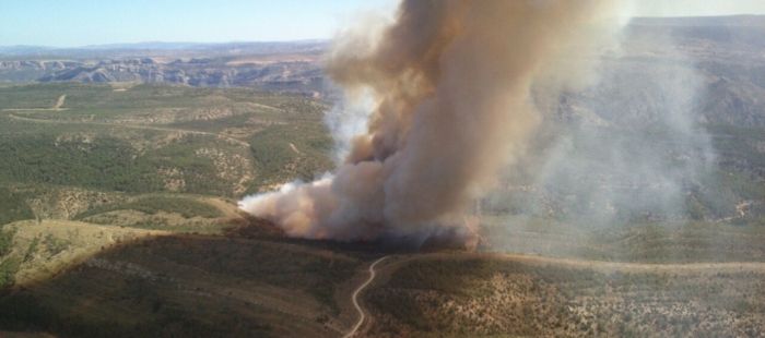 Un nutrido despliegue de medios aéreos y terrestres trabaja en el término municipal de Ejulve para sofocar el incendio detectado a primeras horas de la tarde en las inmediaciones del Barranco de la Cueva Muñoz y de la carretera A1702.