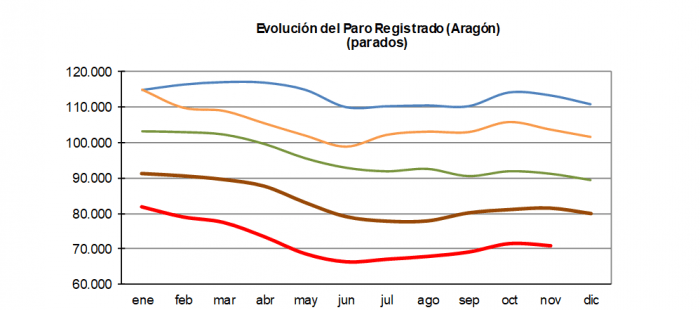 Según los datos publicados este lunes por el Servicio Público de Empleo Estatal, el paro registrado en Aragón al finalizar el mes de noviembre de 2017 ha registrado un descenso del 0,85% respecto al mes precedente, de manera que la Comunidad Autónoma contaba con 70.991 parados registrados en las oficinas públicas de empleo, 608 personas menos que a finales de octubre. Esta evolución mensual es la cuarta más positiva en un mes de noviembre desde el comienzo de la serie histórica en 1989.