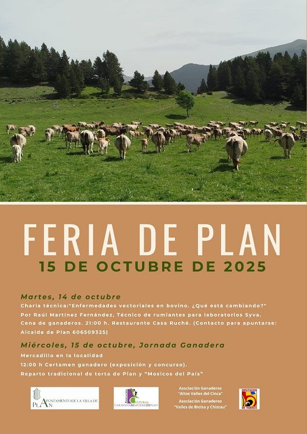 Plan celebra este miércoles, 15 de octubre su tradicional Feria Ganadera. La jornada arranca con un mercadillo, y a partir de las 12 del mediodía certamen ganadero, exposición y concurso, para finalizar con el reparto de torta y música.