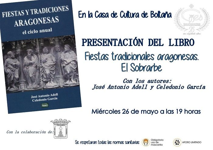 - El miércoles 26 de mayo, a las 19 horas, en la Casa de Cultura de Boltaña, tendrá lugar la presentación del libro ‘Fiestas tradicionales aragonesas’, cuyos autores José Antonio Adell y Celedonio García son muy buenos amigos del Centro de Estudios de Sobrarbe (CES).