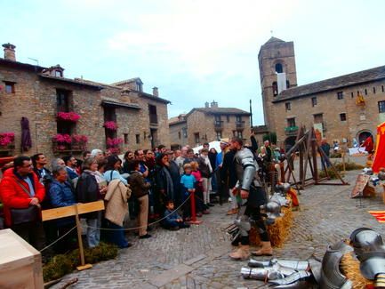 La plaza Mayor de Aínsa se ha convertido este fin de semana en un museo viviente, con diez cápsulas históricas que rememoran los oficios de fustería, botica, abastos, armería, arquería, cocina medieval, almudí, orfebrería y fragua, es el escenario de un proyecto piloto que conmemora la concesión de la reina regente María del documento, firmado en Maella (1423), según el cual se identifica una feria de quince días en esta plaza porticada, y el sello Marchus Ville Ainse, que se imprimía en las piezas elaboradas con metales preciosos por orfebres y plateros locales. El público puede recorrer los puestos que recrean algunos de los oficios más característicos de la Edad Media.