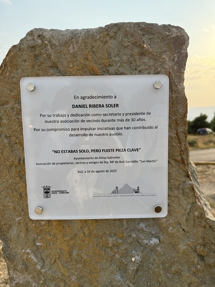 Familia, amigos y vecinos de Buil, en el término municipal de Aínsa, han rendido un sentido homenaje póstumo este fin de semana a Daniel Ribera Soler. Quien fuera presidente de la asociación de vecinos, así como concejal de Barbastro y diputado de la Diputación Provincial de Huesca, fallecía el pasado mes de octubre y ha sido ahora, aprovechando la época estival, cuando sus más allegados, en colaboración con el ayuntamiento, han podido encontrarse en la intersección entre Sarratillo, donde acostumbraba a pasar largas temporadas, y Santa María Buil, para inaugurar un parque en su recuerdo.
