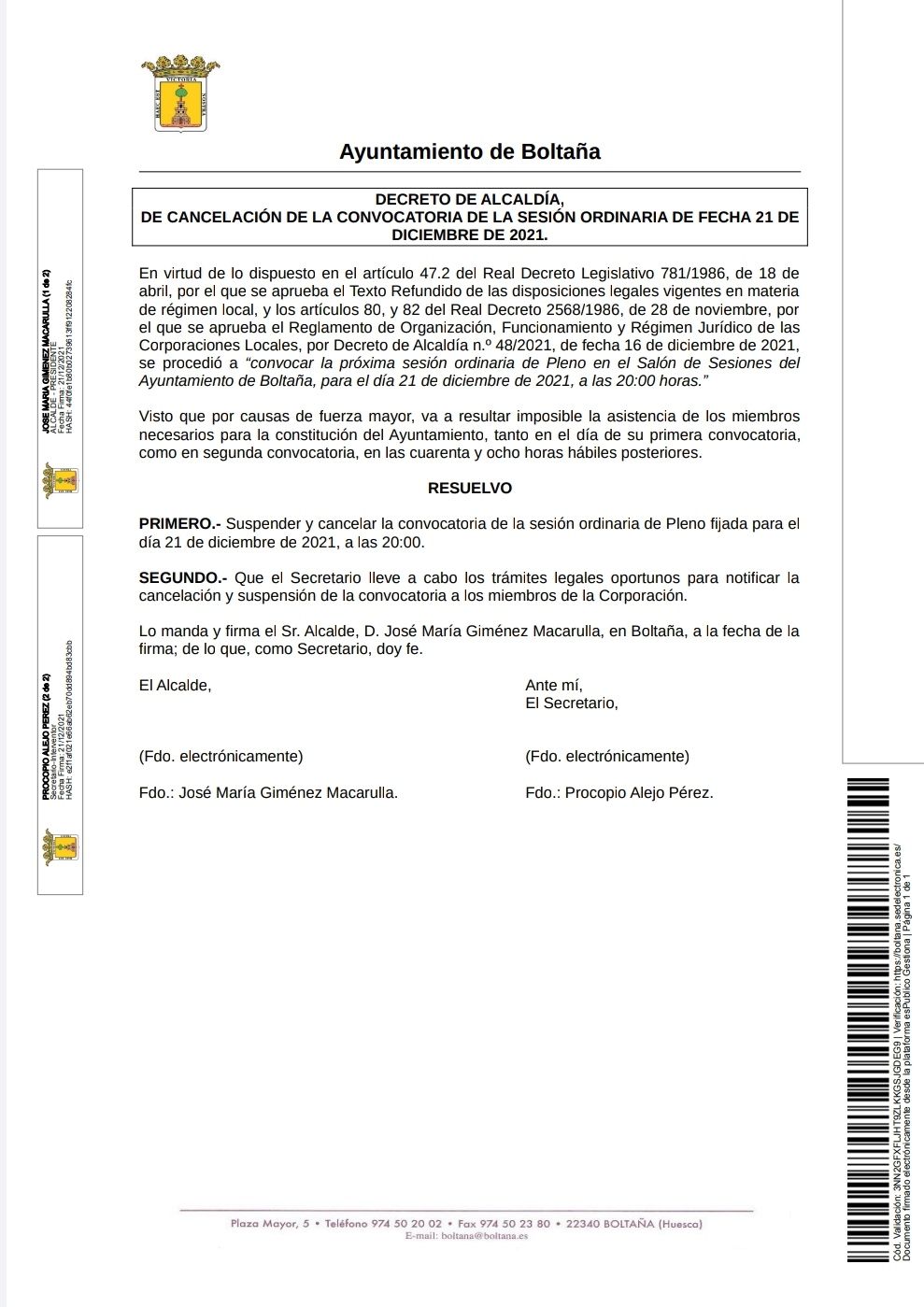Debido a circunstancias de causa mayor que impiden la asistencia de varios miembros del pleno municipal, se ha decidido suspender su celebración, según informa el Ayuntamiento de Boltaña.