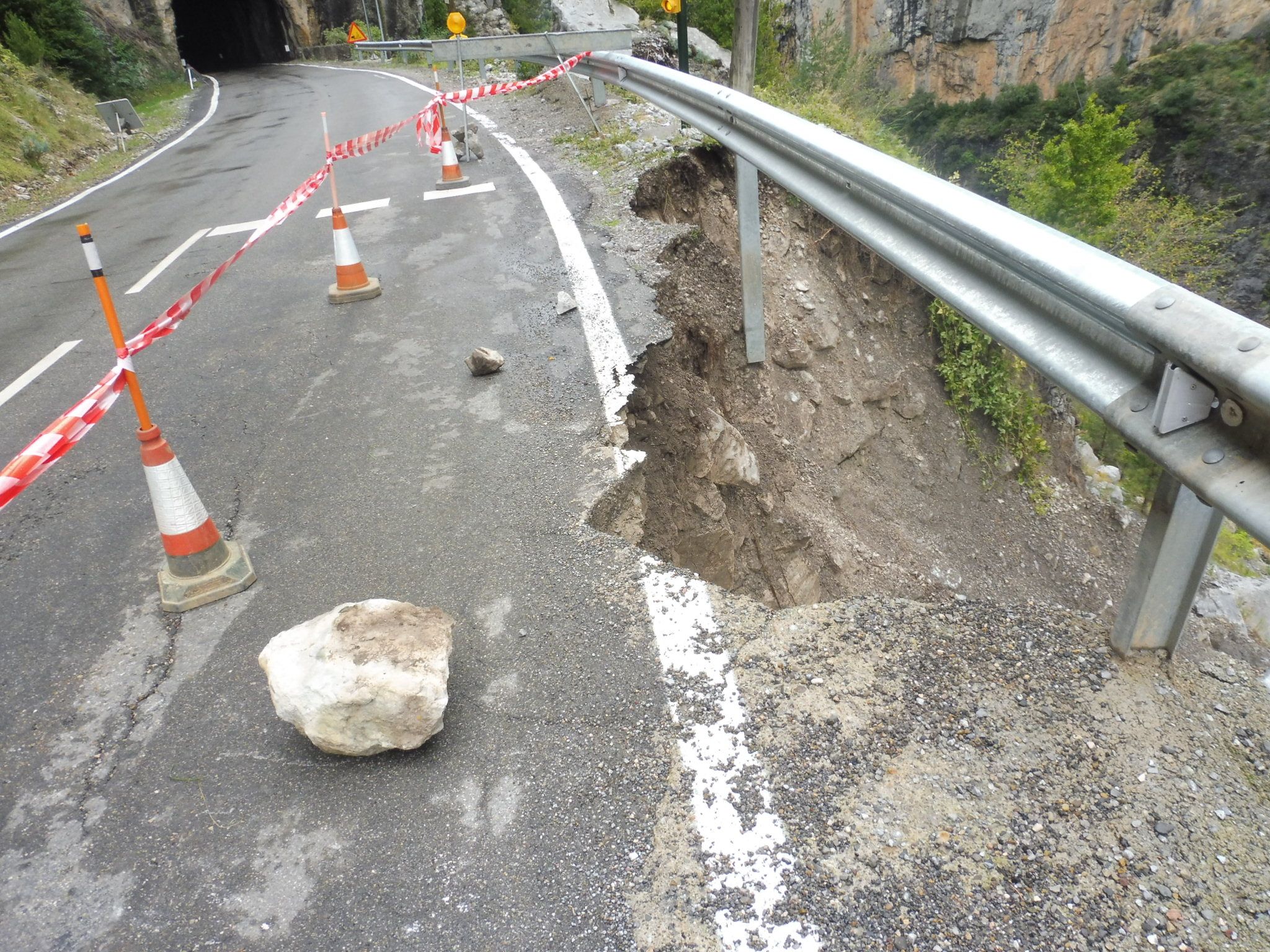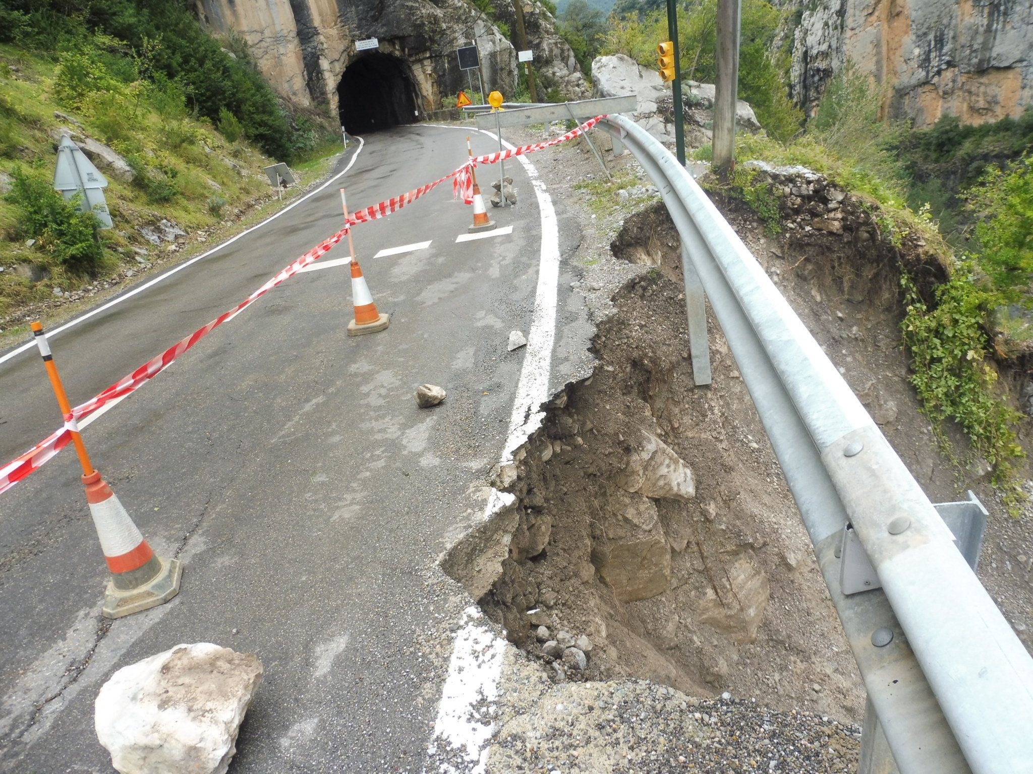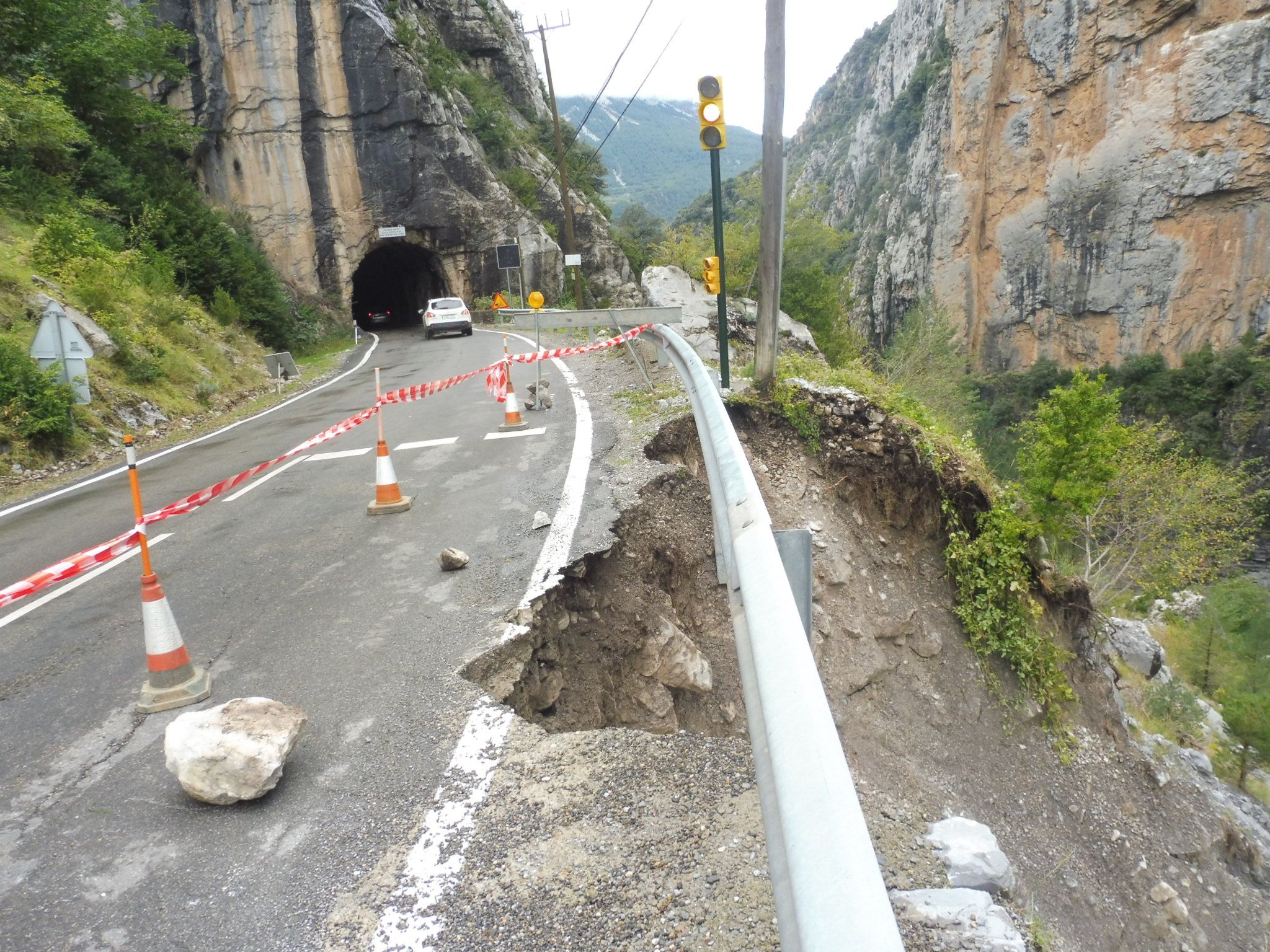 Continúa sin repararse el desprendimiento en el margen de la carrera A-2609, muy cerca de uno de los túneles de Plan. Los hechos ocurrieron a mediados del pasado mes de octubre debido a las intensas lluvias caídas en el valle de Chistau.